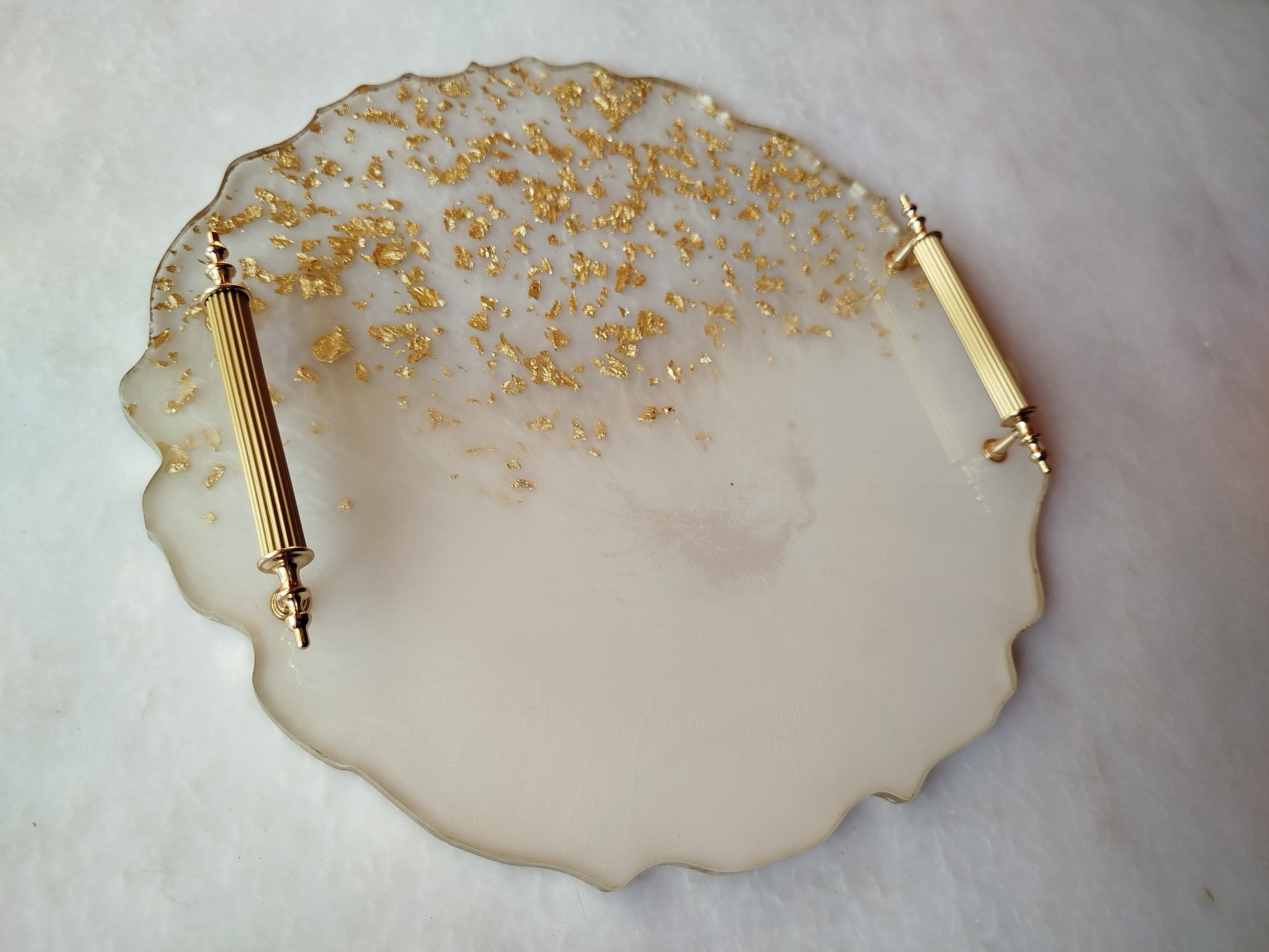 Epoksi altın varaklı kız isteme tepsisi, Türk kültüründe düğün hazırlıklarının vazgeçilmez bir parçası olan kız isteme merasiminde kullanılmak üzere tasarlanmış bir üründür. Bu şık ve zarif tepsinin üzerinde yer alan altın varaklar, Türk el sanatlarının en güzel örneklerinden biri olan ebru sanatından esinlenmiştir.