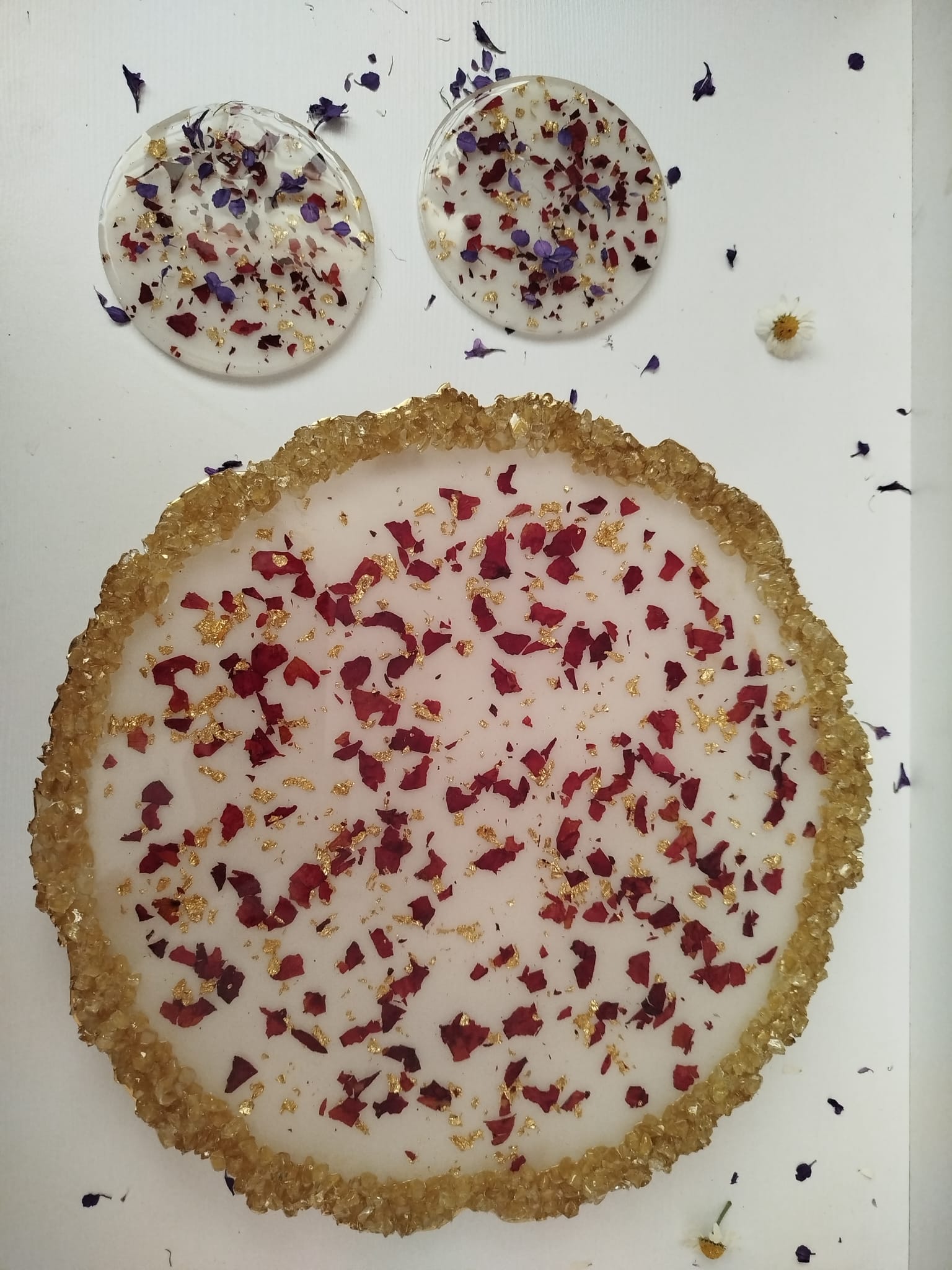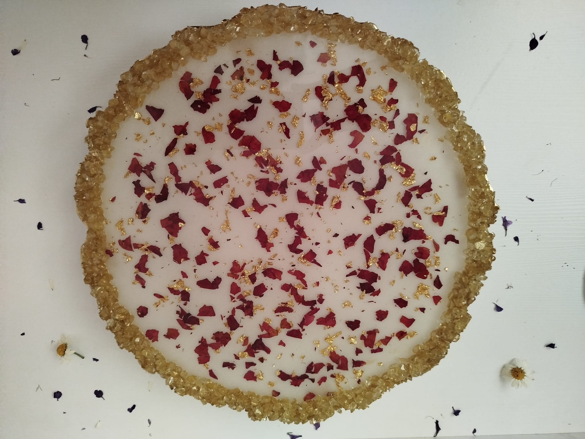 EPOKSİ ALTIN VARAKLI TEPSİ, doğadan ilham alan benzersiz bir üründür. Gerçek çiçeklerin güzelliğini ve doğallığını koruyan tasarımıyla dikkat çekmektedir. El yapımı olarak hazırlanan bu tepsiler, zerafetin ve zarafetin en güzel örneklerini sunmaktadır.